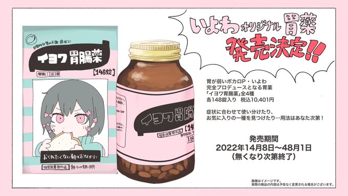 【おしらせ】 この度、いよわプロデュースの""""胃薬""""を発売することになりました! 詳細は画像にて!全4種ご用意しました 細部までやたらこだわったので是非14月8日からお手に取ってもらえると嬉しいです!