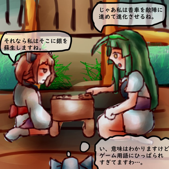 5 6 お題:将棋 私は中学生の時囲碁将棋部という名の ボードゲーム部に所属していましたが大体こんな感じでした。 #東北ずん子深夜の真剣お絵描き60分一本勝負 22/11/12 23:00