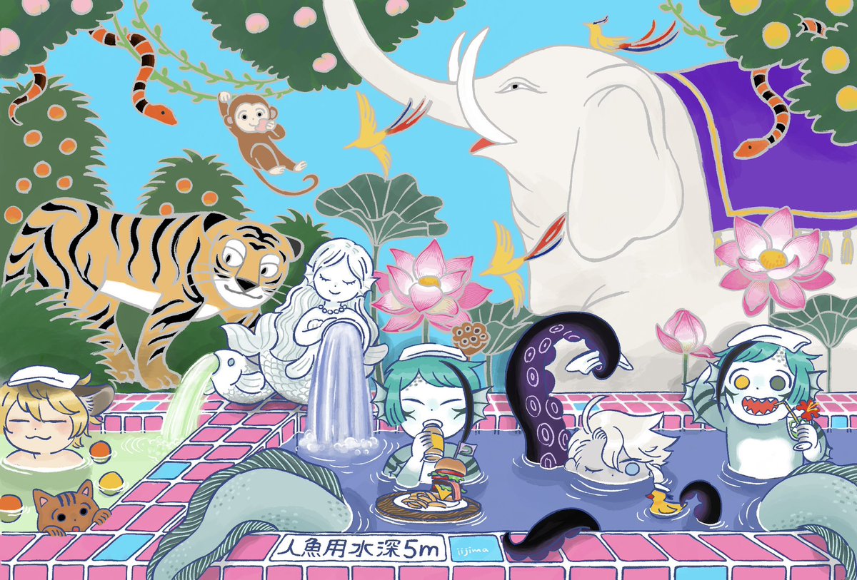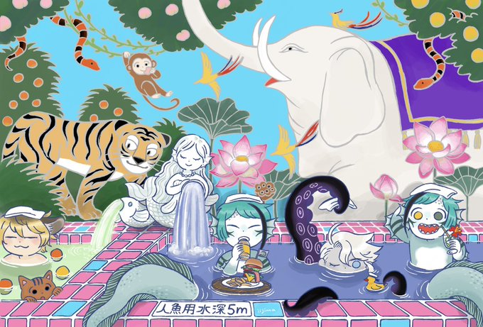 90 482 多人種銭湯♨️ #twstファンアート 春コミで発行予定のイラスト本の表紙がほぼほぼ描けたので見てほしい!☺️ 23/01/14 20:51