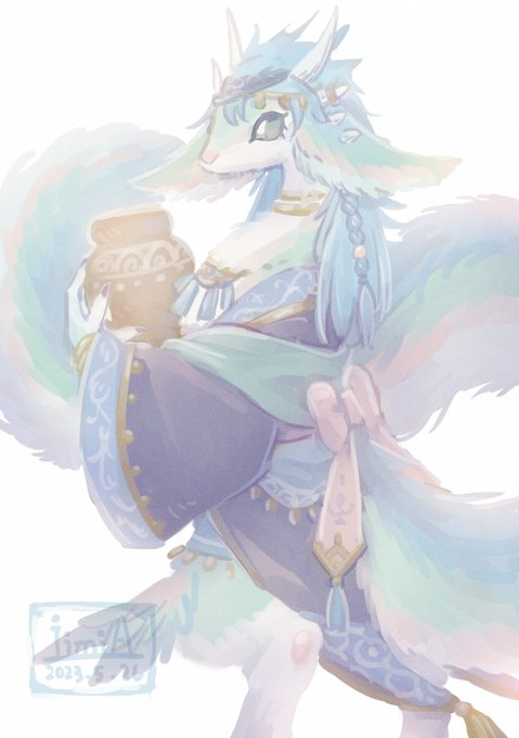 10 45 #人外版深夜の真剣お絵描き60分一本勝負 お題は 「アナタが考える民族衣装を纏った人外」 「ファードラゴン」 もふもふ🐉 23/05/27 00:17