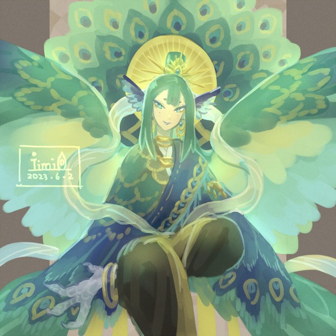 5 16 #人外版深夜の真剣お絵描き60分一本勝負 お題は 「“寺院”から連想する人外」 孔雀明王🦚 23/06/03 00:21