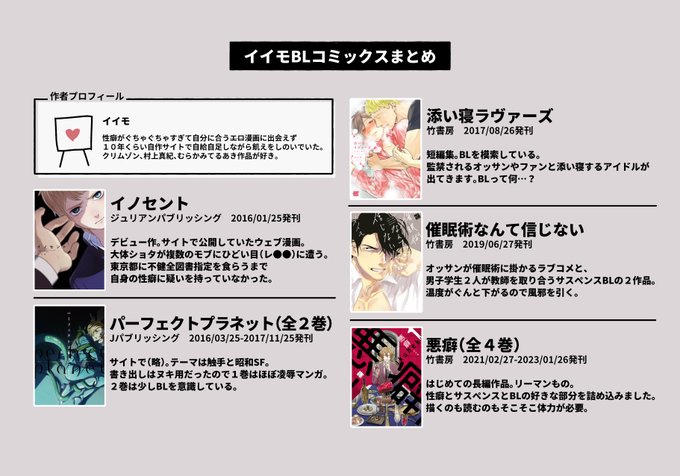 「悪癖」から他作品を探してくださる方を時々見かけるので、描いたBL作品一覧をまとめてるけど所感が入りすぎてうまくいかない…そのうちちゃんと書き直します。 簡易リンク:001.xii.jp/works.html