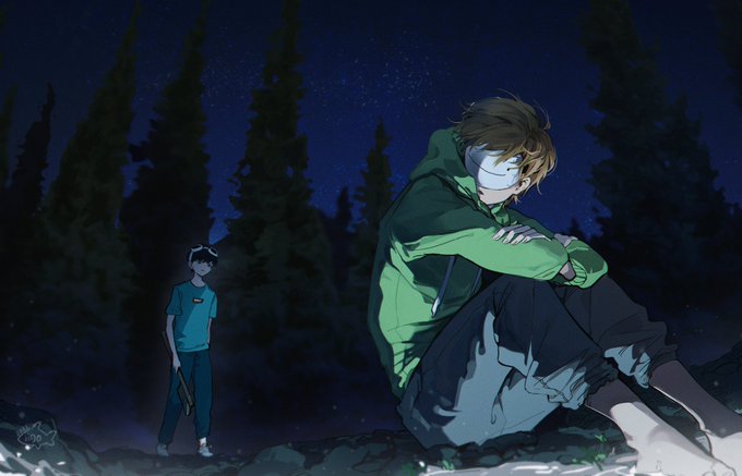 He pulls up his hood, tensing as he anticipates the next subject he'll recognize. At any moment, behind his right shoulder, a voice wil call from the edge of the trees that'll say - “Dream?” #dreamfanart #georgenotfoundfanart #dnffanart Heatwaves.chapter1.Moon jelly