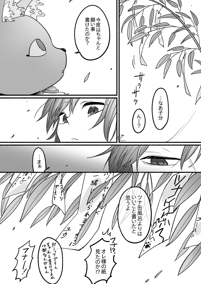 10日遅れの七夕withオンボロ寮グリ監👻🐱 短冊は高いところに付けた方がいいと聞き笹の先端に付けようとするグリ そして絶妙に届かせないゴースト そして程よく腰を屈めて届かせない監督生 #twstプラス