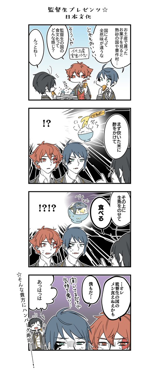 日本文化を紹介する監督生4コマ お寿司編 「私は煮穴子が好き」 ⚠️顔あり監督生 #twstプラス