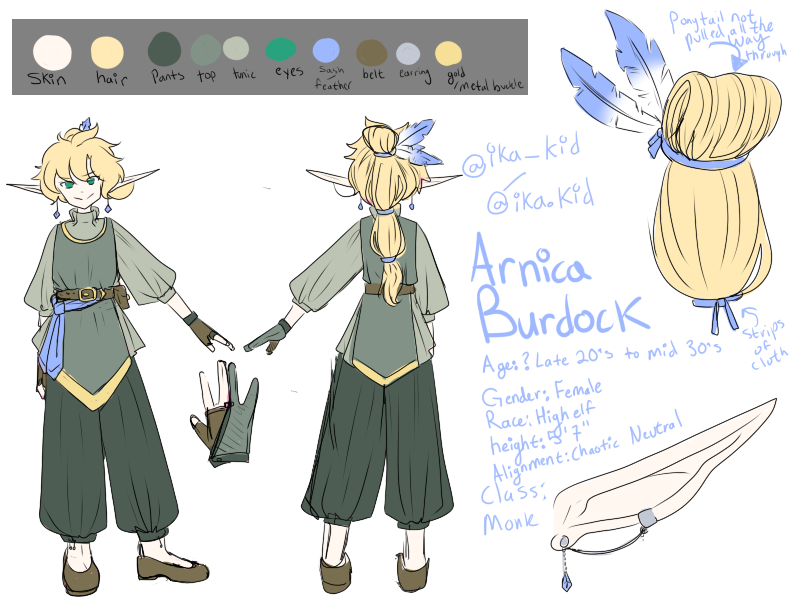 a reference sheet of my elven monk, Arnica Burdock! #dnd #dungeonsanddragons #dnd5e #art #animeart #doodle #drawing #digitalart #ArtistOnTwitter #artistsontwitter #doodle #kawaii #animeart