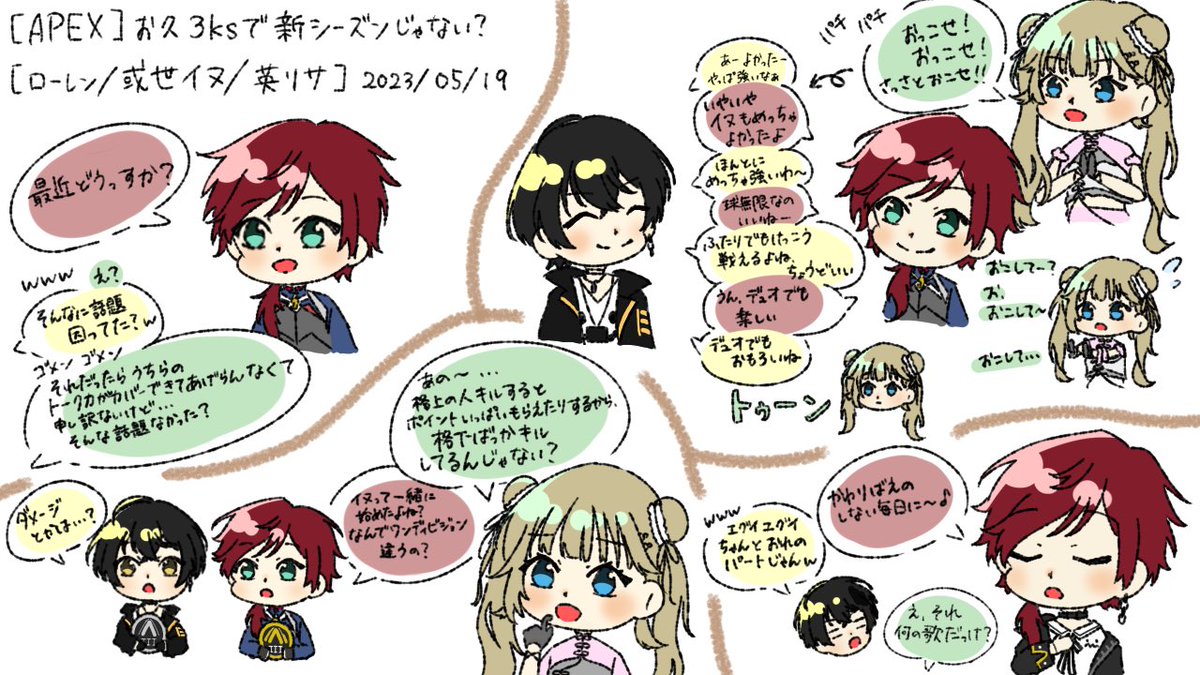 昨日のコラボ面白すぎてこれまだ4時間半くらいある配信の1時間半くらいまでのしか描けてない…またこの3人のコラボ見たいです #イロ絵す #あるせこの絵見て元気出せ #わたらいらすと