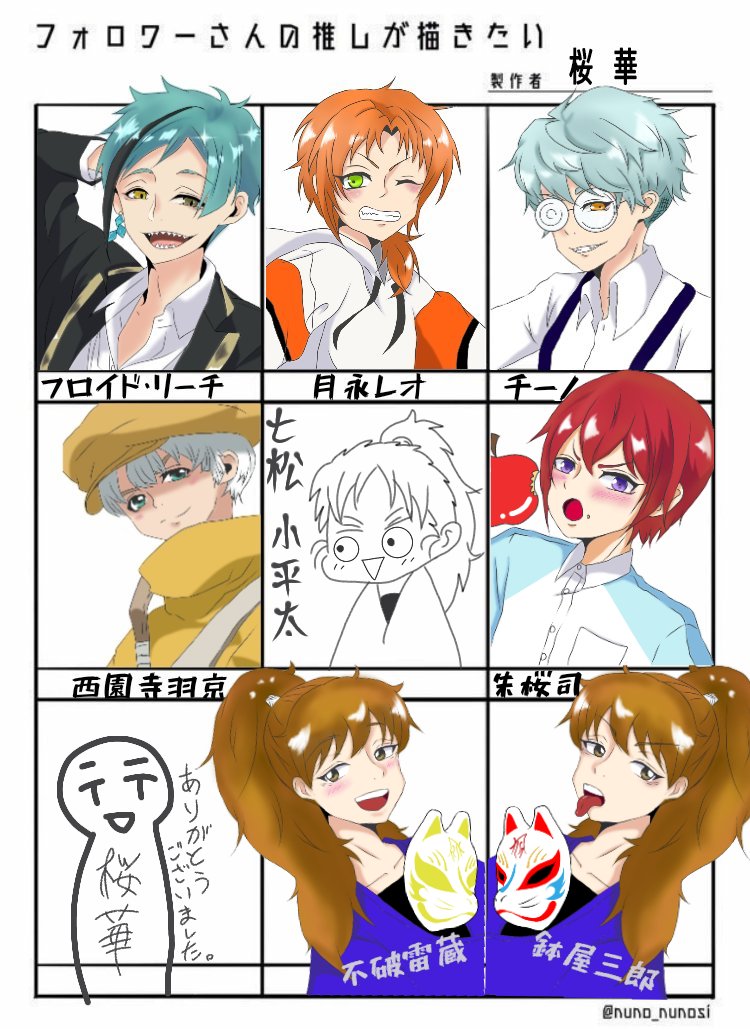 お待たせいたしました。 @ochapa1172 @picog_reine @3_naruse_moy @cocoken0825 リクエストありがとう! フロイド·リーチ、月永レオ、チーノ、西園寺羽京、朱桜司、鉢屋三郎、不破雷蔵。 自分なりに頑張りました👍 #フォロワーさんの推しが描きたい