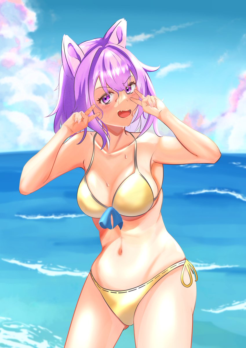 水着ケモ耳ダブルピース! 初めて水着描いたけど 水着は人体に対する理解度誤魔化せないから怖い! #絵描きさんと繋がりたい