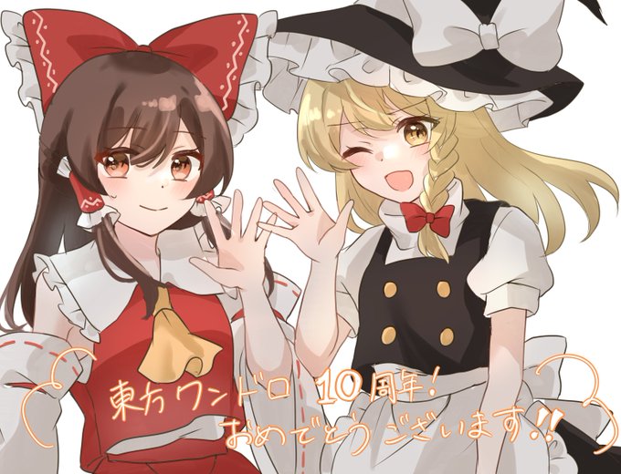 #深夜の真剣お絵描き60分一本勝負 #東方Project 10周年おめでとうございます🎉 大好きな霊夢と魔理沙で大遅刻参加失礼いたします(+45分)