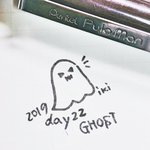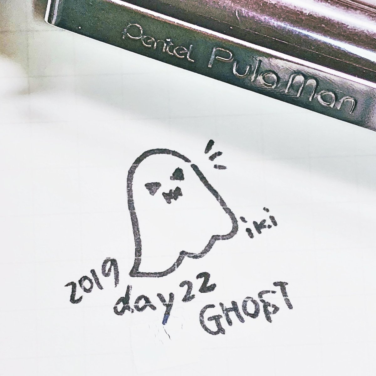 1 1 day22 GHOST #inktober #inktober2019 無理せず描きたいテーマの日だけ描いてます🐟画材はぺんてるプラマンと、くれ竹の金色筆ペン、時々pilotのjuice-up0.3黒のみで。プラマンはゆるりと手の力を抜いて描けるのがすき 19/10/27 18:57