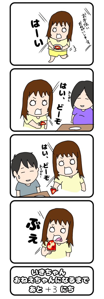 いきちゃん 100日後におねえちゃんになる ~103話~ 配るのは好きだけど ピザは嫌いだった… 今日はママが最後の検診の日です 一応明日が産婦人科から言われた予定日ですが… #漫画 #育児漫画 #子育て #4コマ #4コマR #四コマ #100日チャレンジ #越えてますが最後までがんばる