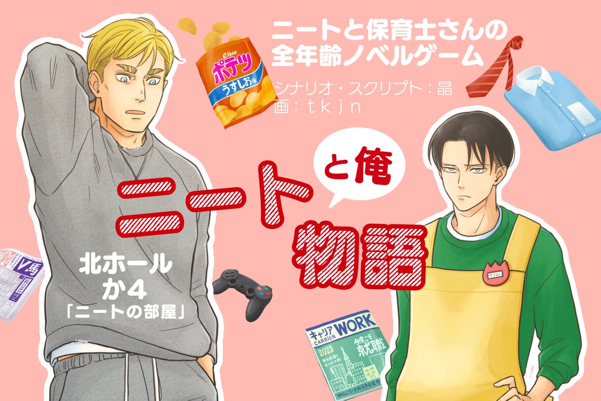 ニイハチ開催ありがとうございます!晶さん(@akira_garland)と合同で保育リさんがニートを育てる?ビジュアルノベルを作る予定です。ニトヴィンを就職させるもよし、ニートとしてますます熟成させるもよし、いろんなルートを妄想するのは普段漫画描く時と違って楽しい〜😁 #20230325_26_ニイハチ