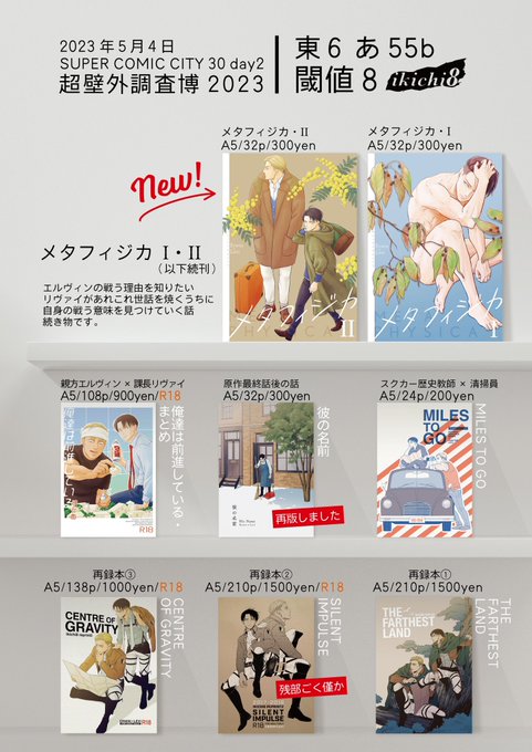 お品書きです。新刊はたくさんあります。 在庫切らしていた『彼の名前』を再版しました。再録2の『SILENT IMPULSE』は残部数冊なのでご入用の方はお早めに。再版予定は今のところ未定です。 5/4 スパコミ超壁博 お品書き | tkjn pixiv.net/artworks/10762…