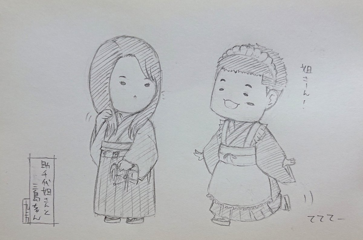 らくがき 『助千代姐さんと三島ちゃん』 すゑの催しのトークでいつかメイドネタやろうって話で三島さんがメイド役やる気満々だったからこんな組み合わせも見てみたいなと。 #すゑ絵
