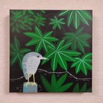 ヤツデにゴイサギ 30x30cmキャンバス、アクリル 厚手のキャンバスに描いてみました。 面白い雰囲気の絵になりました。