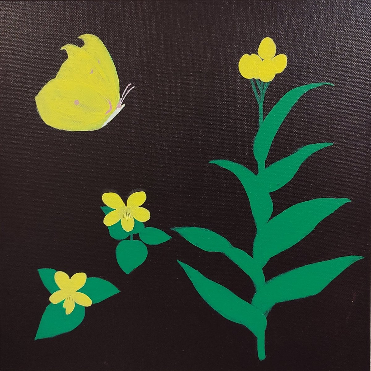 6 81 黄色い春のうちがわ アクリル絵の具、ペン キャンバス(30cm x 30cm) キンラン、キスミレ、スジボソヤマキチョウを描きました。 実際にこの3種が一堂に会することは自然界では無さそうですが。 琳派とか寺の天井に描かれる植物画を意識してみました。 #イラスト #アクリル画 22/04/25 20:47