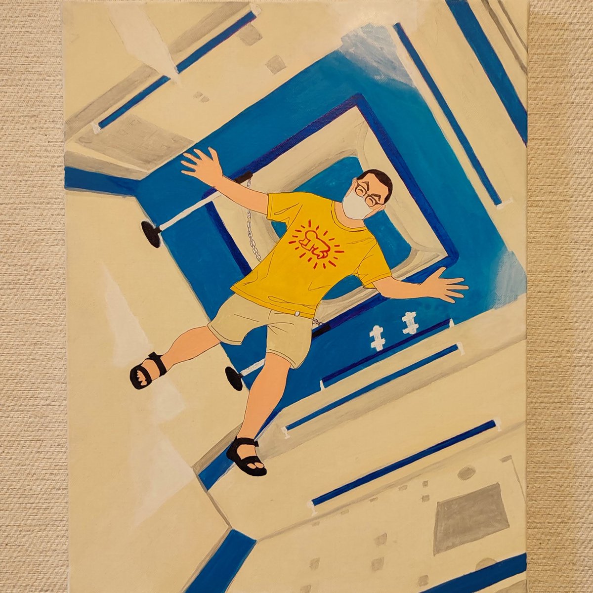 新作完成しました! 「スペースおじさん」 F6キャンバス アクリル絵の具 マーカー 宇宙ステーション(の1/1ジオラマ) で喜ぶおじさんです。 #illust #illustration #art #paintings #美術 #芸術 #絵画 #イラスト #アナログ