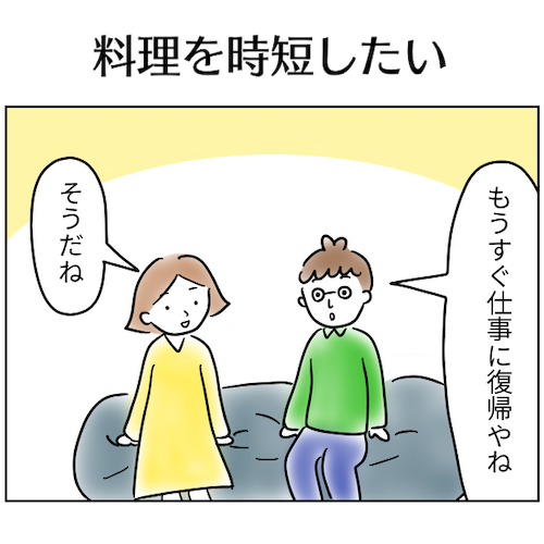 育休4コマ漫画(毎日投稿) 「料理を時短したい」 ついに今月で育休も終わり来月から復帰。。 今以上に時間がなくなりそうで、、どうにか時短出来ないか検討中。料理はまだ色々出来そうやから、ちょっと真剣に考えようかな! #育休 #男性育休 #子育て #1歳 #育児日記 #育児漫画 #4コマ漫画