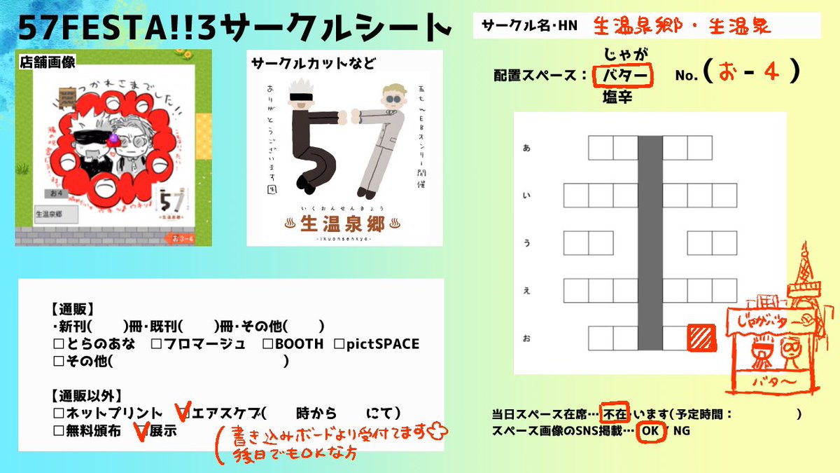 3回目開催おめでとうございます🎊五七のなにかしらの展示が出来ればと思ってます☺️あとエアスケブなどもやれたらなと思います #57FESTA3参加表明 #57FESTA3お品書き
