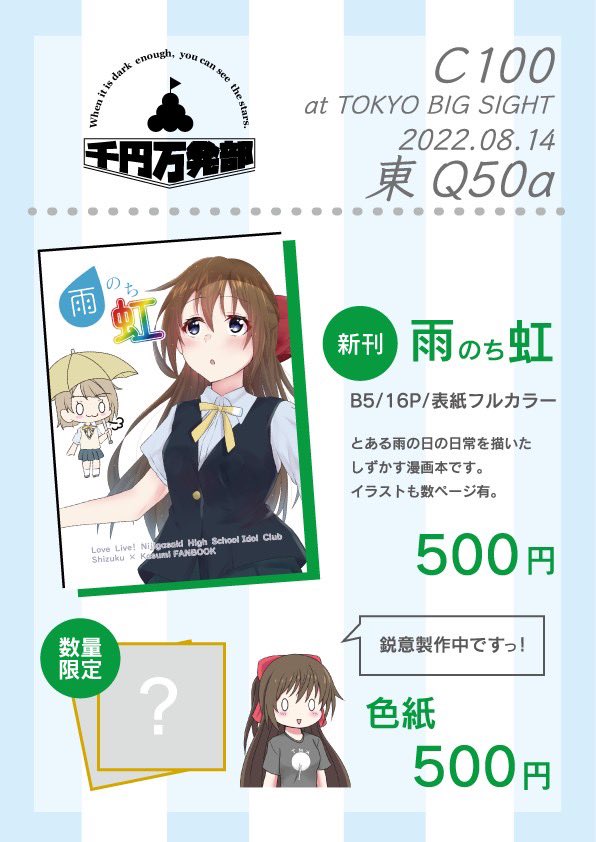 27 47 サンプル不備あったので改めてC100のお品書きです。 新刊(しずかす漫画とイラスト数ページ)と、色紙(13枚限定予定)になります。 色紙は今描いてるので今日の夜か明日くらいには途中経過あげます。 当日はよろしくお願いします。 22/08/11 12:43