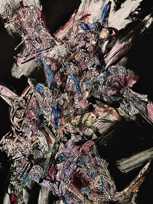 6 85 しー没さんの個展を見た。流動体なのかマシンなのか生き物なのかもしくは只の落書きなのか定かじゃない不可思議な地層です。家計簿のマス目が骨組みであるなら建物をカンバスとしたストリートアートのようでもある。60点以上展示されていて一つ一つ密度も濃いので想定より見応えがあり心して観察した。 22/01/27 21:33