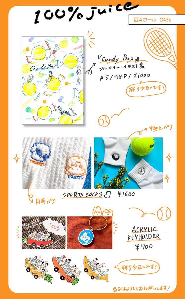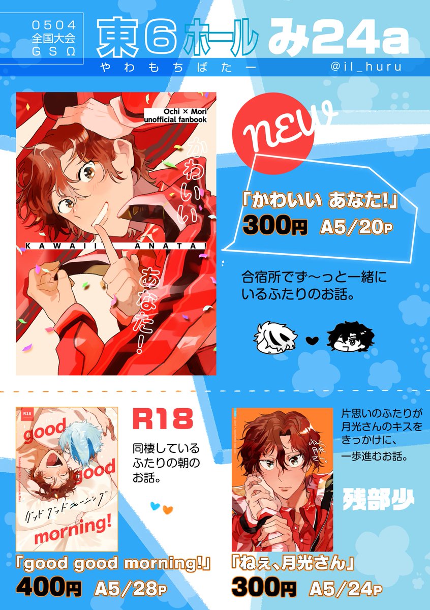 5/4🎾お品書きです! 新刊のほか、既刊と過去グッズももっていきます〜 よろしくお願いします🌼 新刊サンプル:pixiv.net/artworks/10766… 本通販:ec.toranoana.jp/joshi_r/ec/ite…