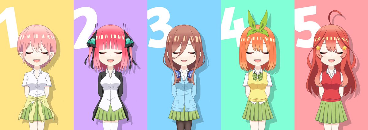 とりあえず五人繋げてみました。ヘッダーに使うとカラフルで綺麗です。 #五等分の花嫁 #中野一花 #中野二乃 #中野三玖 #中野四葉 #中野五月 #イラスト #せかんど