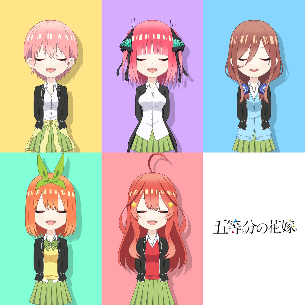 82 477 とりあえず五人繋げてみました。ヘッダーに使うとカラフルで綺麗です。 #五等分の花嫁 #中野一花 #中野二乃 #中野三玖 #中野四葉 #中野五月 #イラスト #せかんど 20/06/06 08:11