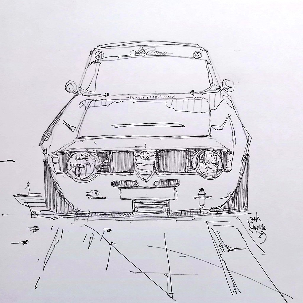 一発描き🐰70日目 同じ絵で1枚目車の形が悪くて没、これ2枚目ボンネットが長過ぎだけど押して描きました。背景は端~端まで大観衆だけどやめ、、44分の戦いでした(' ' ;) #一発描き #art #drawing #模写 #illustration #イラスト #100日チャレンジ #イラスト好きさんと繋がりたい #コピック #TA64