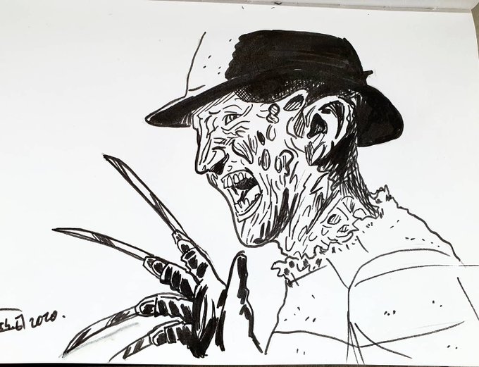 The original nightmare for 'sleep' today on #horrorinktober #horrorinktober #inks #inktober2020 #comics #comicart #art #inktober #fanart #drawingcomics #drawing #illustration #blackandwhite #sketch #sketches #tattoo #scary #tv #movies #horror #freddykrueger #80s #nightmare