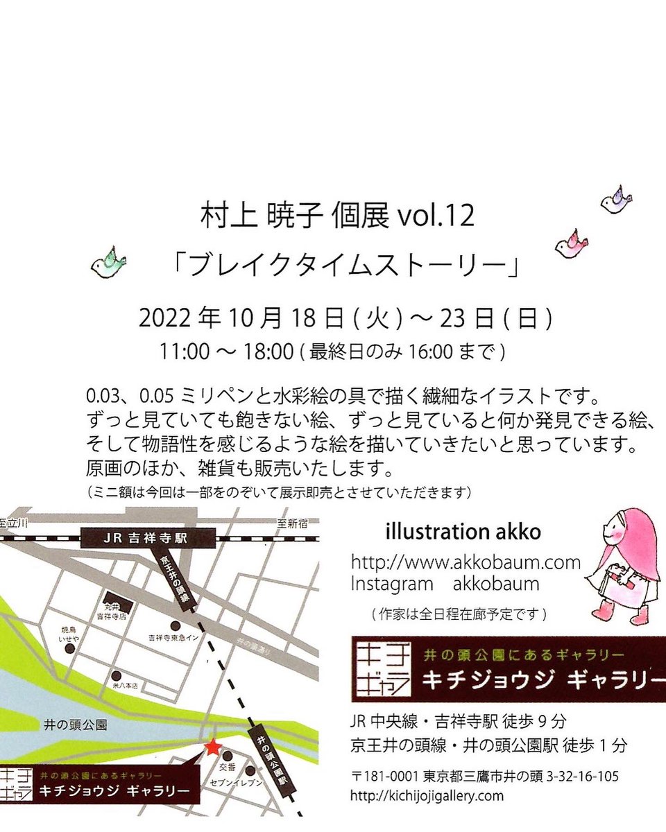 🌳村上暁子 個展 vol.12🌳 「ブレイクタイムストーリー」 キチジョウジギャラリー kichijojigallery.com 2022年 10月18日(火)〜23日(日) 11:00〜18:00(最終日16:00まで) #キチジョウジギャラリー #イラスト個展 #井の頭公園 #水彩画 #ミリペン #イラストレーター