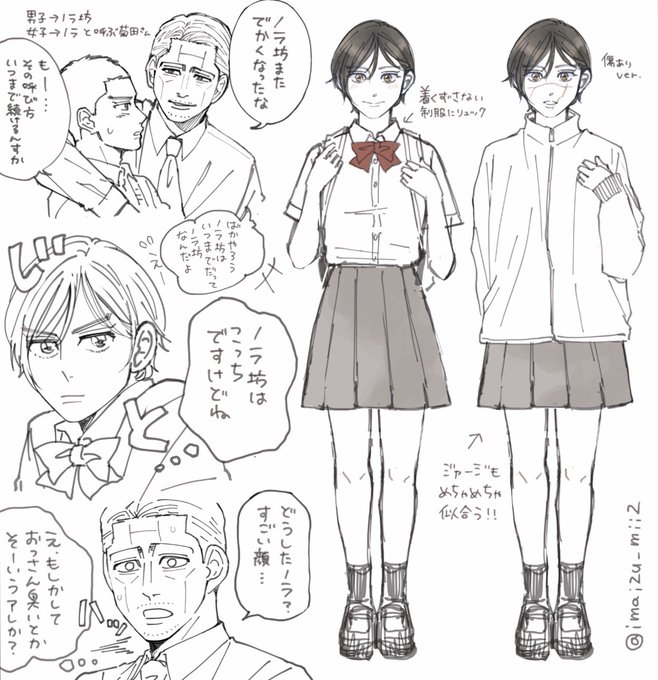 ※女体化注意 この前ツイートした菊にょた杉(男女双子杉)です。杉♂の前ではカッコいい菊i田さんだけど杉♀の前ではダメダメおじさんになってしまう菊i田さん。 twitter.com/imaizu_mii2/st…