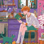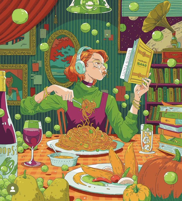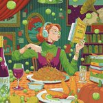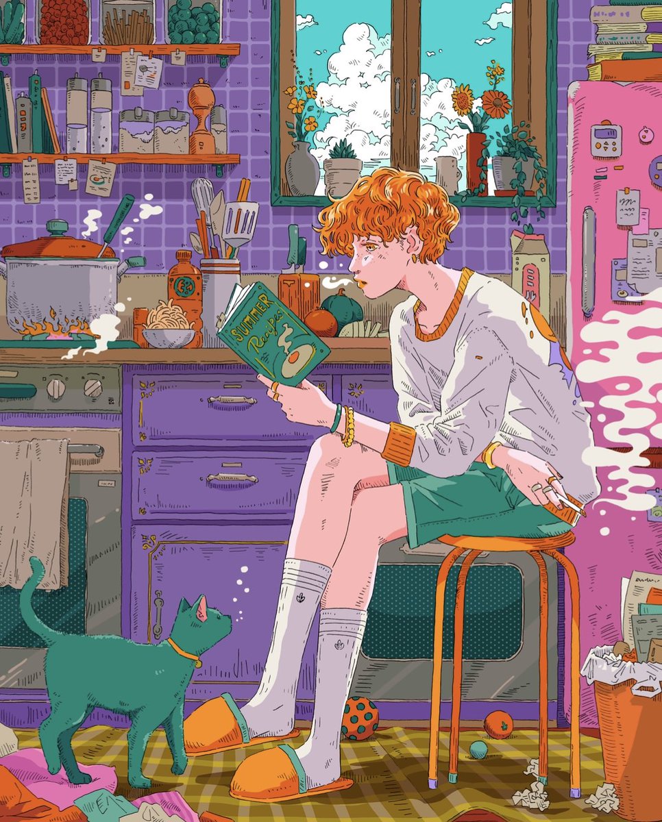 【Simmering summer】 It's hot in the kitchen in the summer. Simmer while reading a book. 夏のキッチンは暑い。好きなレシピ本を見ながらコトコト煮込みます。 #グラフィックデザイン #キャラクターデザイン #illustration #イラストレーション #イラスト #design #デザイン