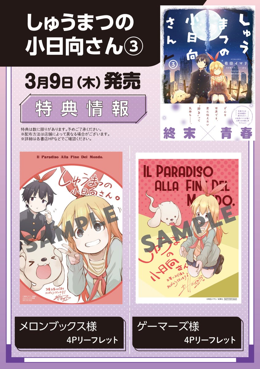 本日3月9日に『しゅうまつの小日向さん』の第3巻が発売します!ありがたいことに今回も各書店様で特典がありますのでチェックして頂けると嬉しいです!今巻が最終巻となりますが最後まで楽しんで頂けたらいいなぁ…どうぞよろしく言お願いします!! →amazon.co.jp/dp/B0BTD73NMQ