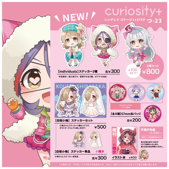 33 61 5/21(日)開催の「いつでもいっしょに142's#3」の お品書きです~!スペースは【幸子-07/curiosity+】です🍊 新作グッズはカワイイ幸子のアクキーとカワイイグッズセットです❣当日はどうぞよしなに~!色紙もあるかもです! #いついち 23/05/19 07:02