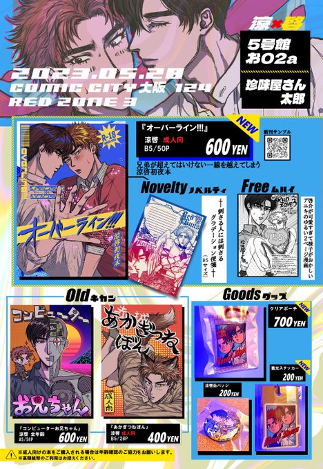【5/28 COMIC CITY 大阪 124】 RED ZONE3 おしながき 新刊既刊サンプル等はリンク先キャプションにまとめました pixiv.net/artworks/10829… 内容物はオール涼啓です🌹🐤 初インテなのでだいぶワタワタしてると思いますが当日は何卒よろしくお願いいたします..!🙏 5号館 お02a にてお待ちしております⛺️