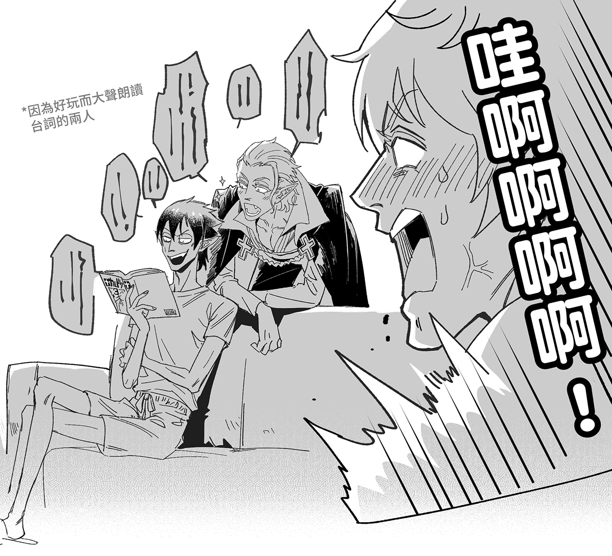#吸血鬼すぐ死ぬ #吸死 imagine the interaction of 本&△ (3) ※Sorry about I only speak Chinese, I hope you can understand by looking at the pictures.🥲 P1.一起唸羅納德戰記台詞的△雙人。 P2.△隊長幫羅納德挑錯字、和語順。 P3.畏怖!!