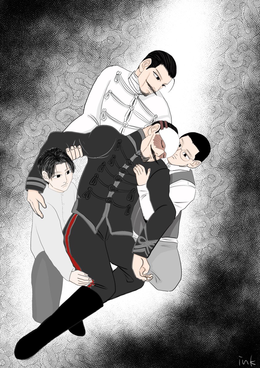 お題:ゴールデンカムイ(自由) フィレンツェのピエタが元ネタです。未完成のままの聖母マリアの位置に架空の篤四郎少年。幼少期見てみたいですね #ゴールデンカムイ版深夜の真剣お絵描き60分一本勝負