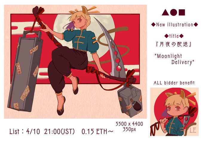 🌗Minted a new illustration!🌓 新作をMintしました! 『月夜の配送』 "Moonlight Delivery" foundation.app/@imo_guru_3/my… List:4/10 21:00(JST) Start:0.15ETH~ All bidders benefit:NFT icons #nft #NFTartist #FoundationNFT