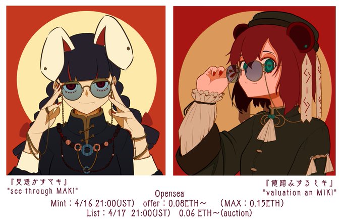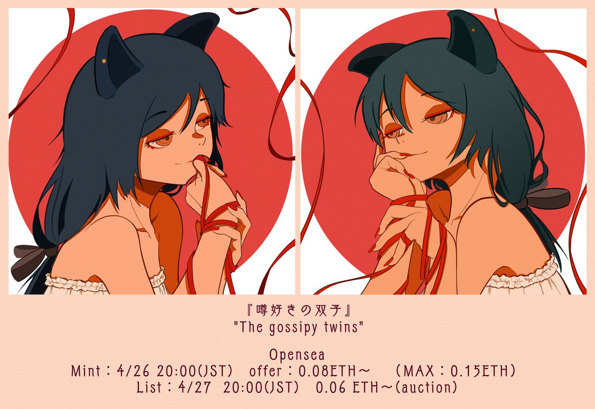 🎀新作告知🎀 『噂好きの双子』 Mint:4/26 20:00(JST) offer:0.08ETH~(即決上限 0.15ETH) 4/27 19:30〆 最も高いofferの方にお譲りします。 list:4/27 20:00(JST) "0.06ETH~" Auction(24h) (それぞれ別イラストです) opensea.io/collection/imo… #NFTCommunity #nft #NFTartist