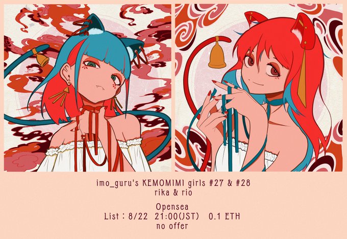 🐱New Kemomimi girls 🐱 imo_guru's kemomimi girls No. 27,28 list:8/22 21:00~(JST) price:0.1ETH(no offer) How about a cute and slightly bewitching girl? opensea.io/collection/imo… #NFTCommunity #nft #NFTartist