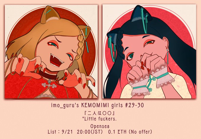 🐱New Kemomimi girls🐱 imo_guru's kemomimi girls No. 29-30 list:9/21 20:00~(JST) price:0.1ETH(no offer) How about a cute and slightly bewitching girl? opensea.io/collection/imo… #NFTCommunity #nft #NFTartist
