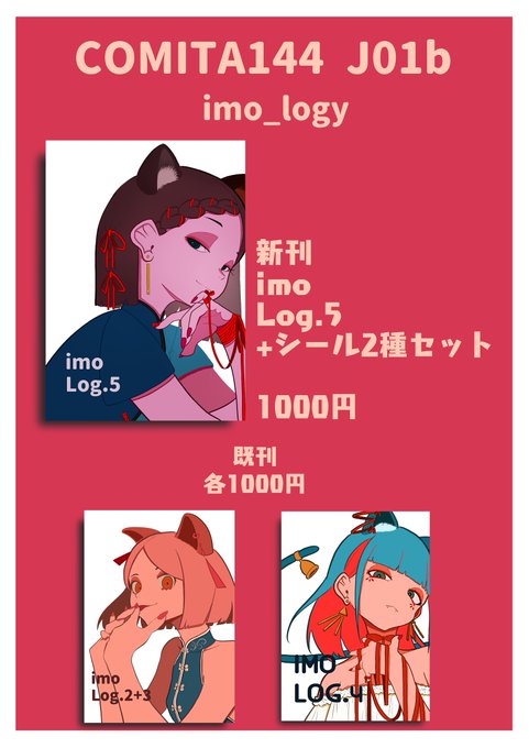 明日!コミティア!出ます!! 新刊はB5+シール2種で1000円です。セットが無くなったらシール単体で頒布しますが多分無くなるってことはないかと。 J01b imo_logyにて。 どうぞよろしくお願いいたします!!! #COMITIA144 #コミティア144