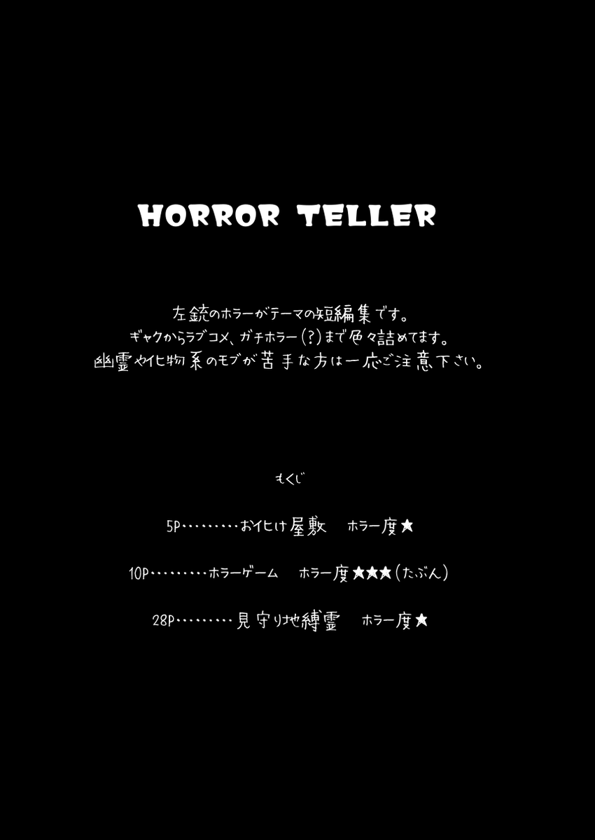 8/20左銃新刊サンプルです! ]ホラーがテーマの左銃短編集です。ギャクからラブコメ、ガチホラー(?)まで色々。 幽霊・化物系のモブがいるのでご注意下さい。 pixiv.net/artworks/11083…