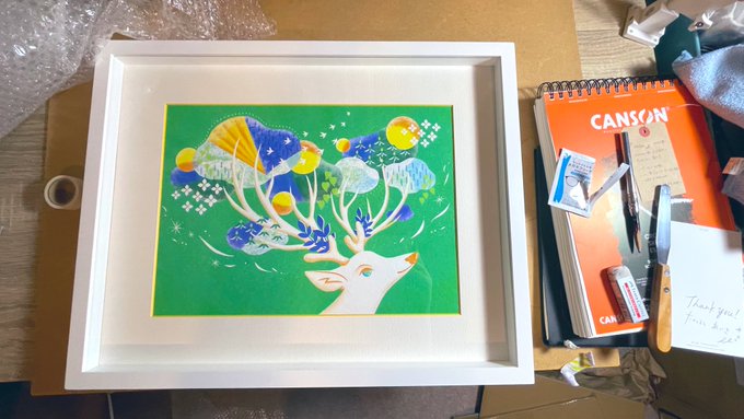0 17 結局深夜に額装作業🌃 カスタマイズ注文した、内側がイエローのマットも白い額も作品と合ってて良き仕上がり✨明日はギャラリーに発送します😊 #art #illustration #イラスト #ジークレー印刷 22/08/26 02:51