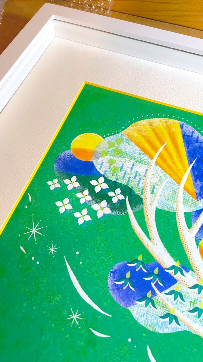 結局深夜に額装作業🌃 カスタマイズ注文した、内側がイエローのマットも白い額も作品と合ってて良き仕上がり✨明日はギャラリーに発送します😊 #art #illustration #イラスト #ジークレー印刷