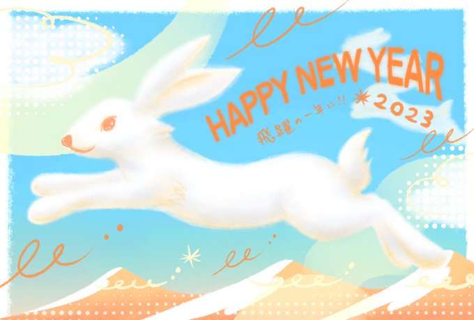 🎊 2023年あけましておめでとうございます🎍✨ 皆さま昨年は大変お世話になりました。本年もどうぞよろしくお願い致します✨ 私は今日から仕事始めです😊 晴れ渡ったお正月の空の雲が、ジャンプして飛んでいるウサギに見えました🐇大きな飛躍の年になることを願っています🌈✨ #イラスト #年賀状