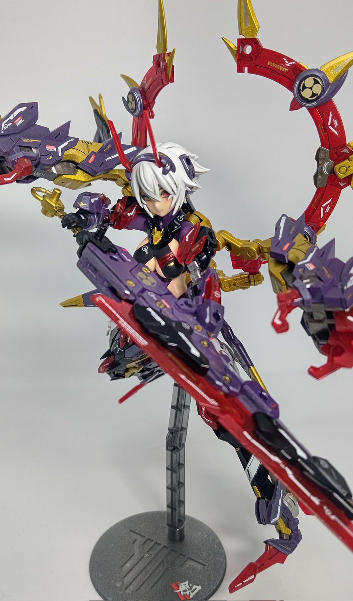 無事スサノヲ完成ー デカール盛り盛りにするのは楽しいね 貼り終えるまで10時間くらいかかったけど… ちな作業中周回していた遠征卒業タイラーさんのHPは終わる頃には1900を越えていたそうじゃ… #メガミデバイス #皇巫スサノヲ