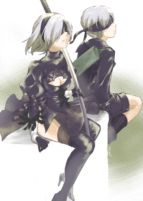 @o_i_cyan さんの推し、2Bさん(と9Sくん)。絵を描く時は基本的にオトマタのOSTエンドレスなもので、描く→感情入りすぎる→違う!こんなのは2Bじゃない!!(消す)を繰り返し生まれた2Bちゃんです…w おいもさんありがとうございました! #フォロワーさんの推しが描きたい #ニーア #幻影戦争
